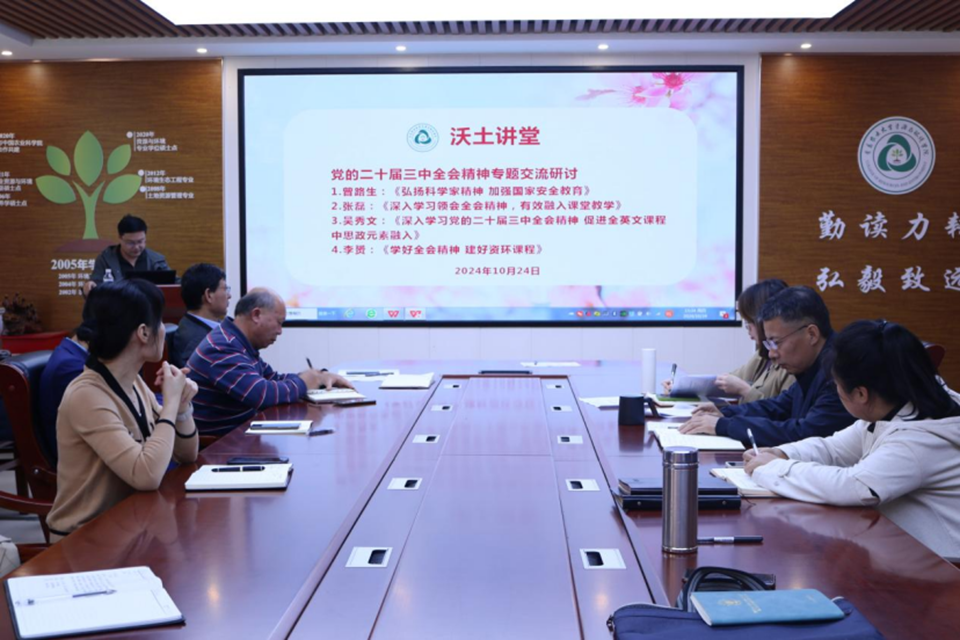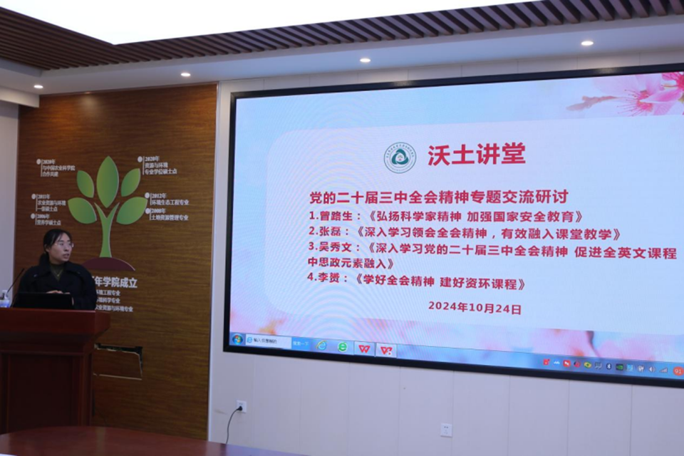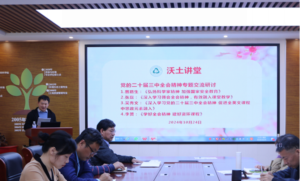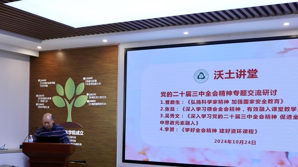 李赟老师以《学好全会精神,建好资环课程》为题作汇报交流。他表示要更加深刻理解党的二十届三中全会精神对专业的重要意义,并将全会精神有机融合到专业教学中,加强课程思政,创新教学方法,提高教学效率,培养具有高度社会责任感和专业素养的资源环境类专业人才。