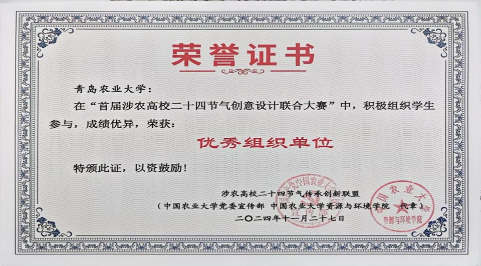 前期在中国农业大学70net永乐高的牵头下,70net永乐高积极响应,精心组织承办了本校层面的“涉农高校二十四节气创意设计联合大赛”。大赛以“深入贯彻习近平文化思想,强化二十四节气传统文化在大学教学体系与科研活动中的深度融合,传承、创新和弘扬中华优秀传统文化精髓”为主旨。在组织过程中,学院通过多种渠道广泛宣传,吸引了众多学生的积极参与。教师们充分发挥指导作用,帮助学生深入挖掘二十四节气的文化内涵,给予专业指导,激发创意灵感,进一步提升作品的质量。经学校决赛选出优秀作品推荐至首届涉农高校二十四节气创意设计联合大赛决赛,作品最终取得了二等奖的好成绩。70net永乐高获得优秀组织单位。