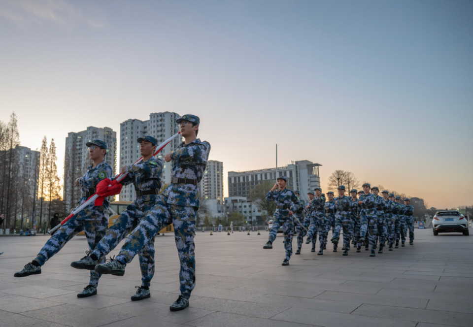 晨光熹微中,国旗护卫队队员昂首挺胸,迈着整齐划一的铿锵步伐护送五星红旗入场。雄壮的国歌奏响,鲜艳的五星红旗冉冉升起,全体师生肃立行注目礼,深切表达对祖国的崇高敬意与热爱。