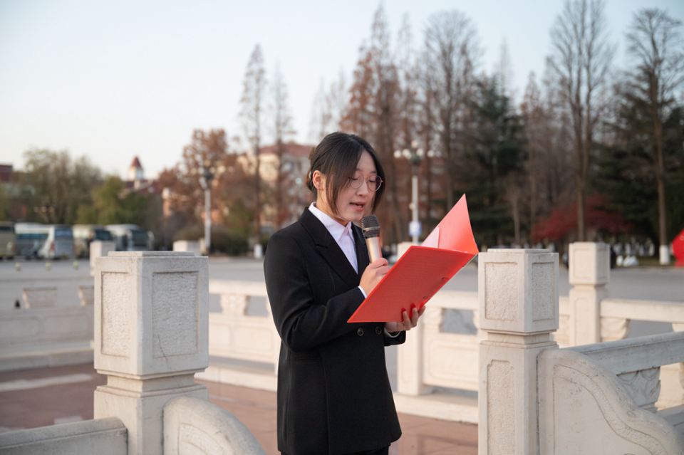 学院学生代表、2022级环境生态工程专业郑琪作“以青春赴使命,以实干践初心”主题发言。她结合自身入学以来的成长经历提出了以下四点倡议:一是以学术为基,在科研探索中厚植家国情怀;二是以实践为翼,在知行合一中锤炼担当本领;三是以奉献为壤,在志愿服务中传递青春温度;四是以责任为炬,在学生工作中凝聚奋进力量。她号召同学们以理论武装思想、以实干锤炼本领,在知行合一中践行青年担当,为中华民族伟大复兴贡献青春力量。