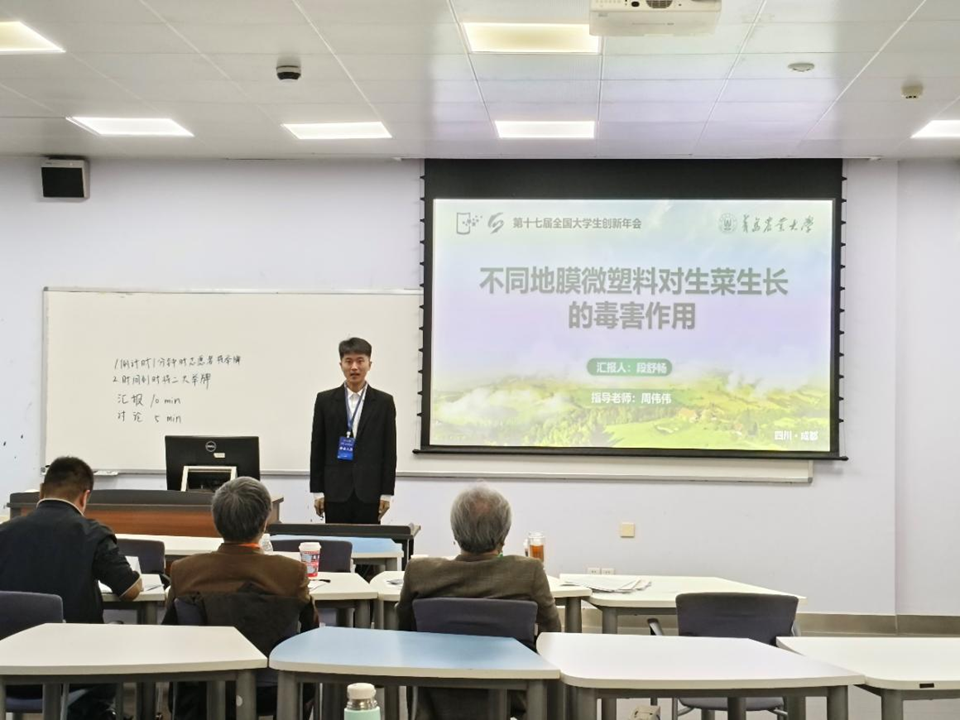 入选项目为我院周伟伟副教授指导的《不同地膜微塑料对生菜生长的毒害作用》。该项目聚焦农用薄膜土壤残留问题,比较研究了传统生物不可降解地膜与新型生物可降解地膜微塑料对生菜生长的毒害影响,发现新型生物可降解地膜微塑料对生菜生长的毒害作用显著大于传统不可降解地膜微塑料,为农膜微塑料特别是新型生物可降解微塑料的污染防控提供了重要理论依据。该研究成果已发表在环境领域国际著名期刊《Environmental Pollution》上,项目组成员段舒畅作为代表在全国大学生创新年会上进行了汇报交流。