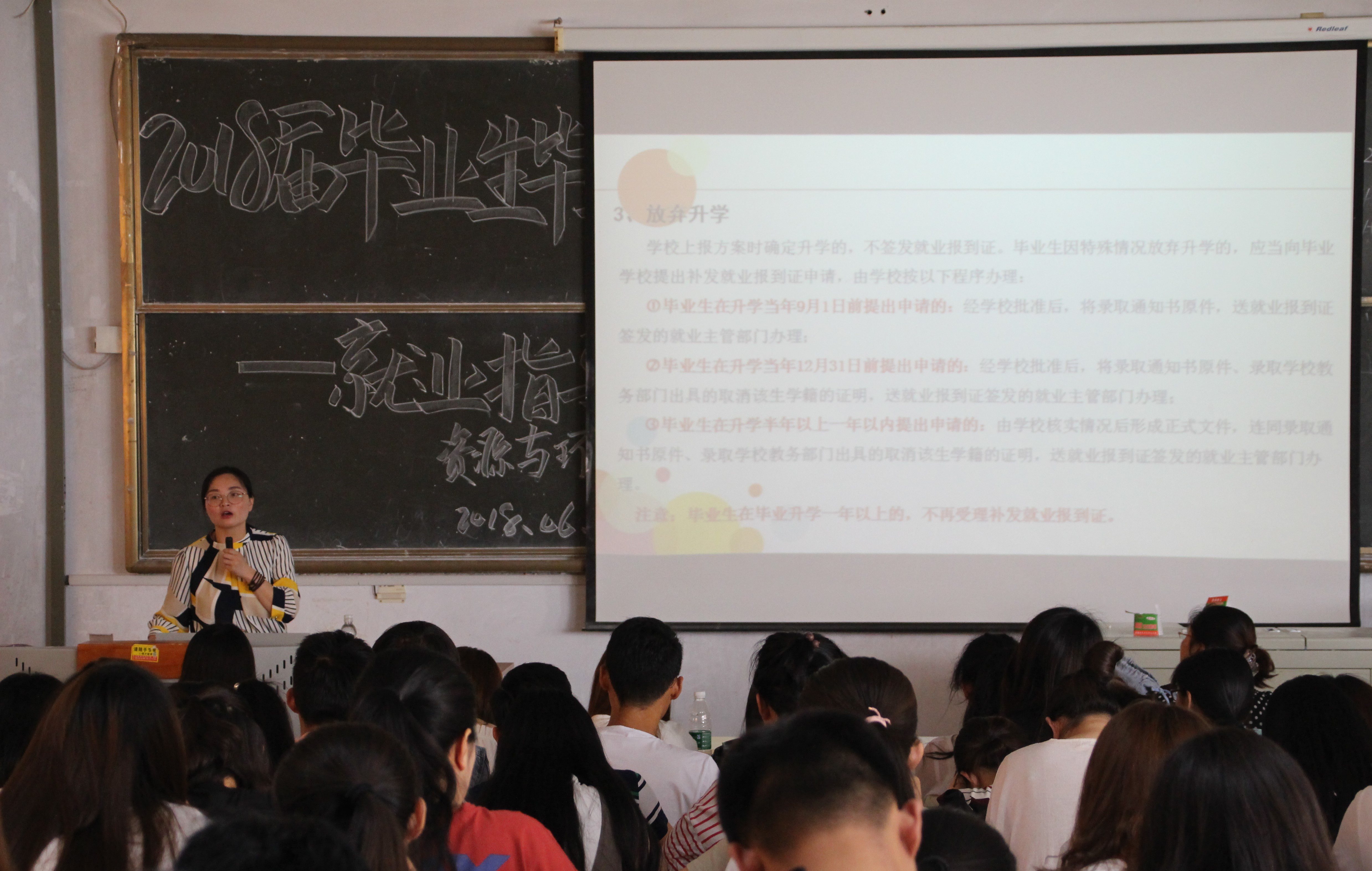 会议伊始,吕国莹就2018届毕业生就业政策及规定向全体毕业生进行了体系分析,从签约、解约、派遣及报到、个人档案、调整与改派、西部计划、三支一扶、应届生等八个方面进行了详细讲解。面对老师的耐心讲解,同学们也在仔细聆听,农业资源与环境1404班刘有谈到:“面对不容乐观的就业现状,更应该思考的是如何积极应对,它促使了就业选择的多元化,我们每一位应届毕业生都应该尽早准确定位,树立科学的择业观念。”