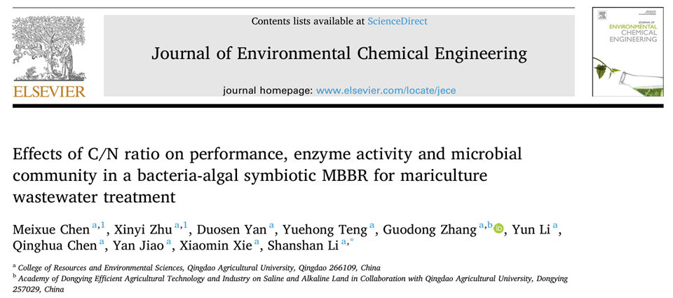 近日,70net永乐高环境工程专业2021级本科生陈美学在李姗姗教师的指导下,于环境科学领域国际著名期刊《环境化学工程学报》(Journal of Environmental Chemical Engineering,中国科学院二区Top,IF=7.4)上发表了题为“Effects of C/N ratio on performance, enzyme activity and microbial community in a bacteria-algal symbiotic MBBR for mariculture wastewater treatment”的研究论文。该论文以70net永乐高为完成单位,陈美学为论文的第一作者,李姗姗教师为论文的通讯作者。