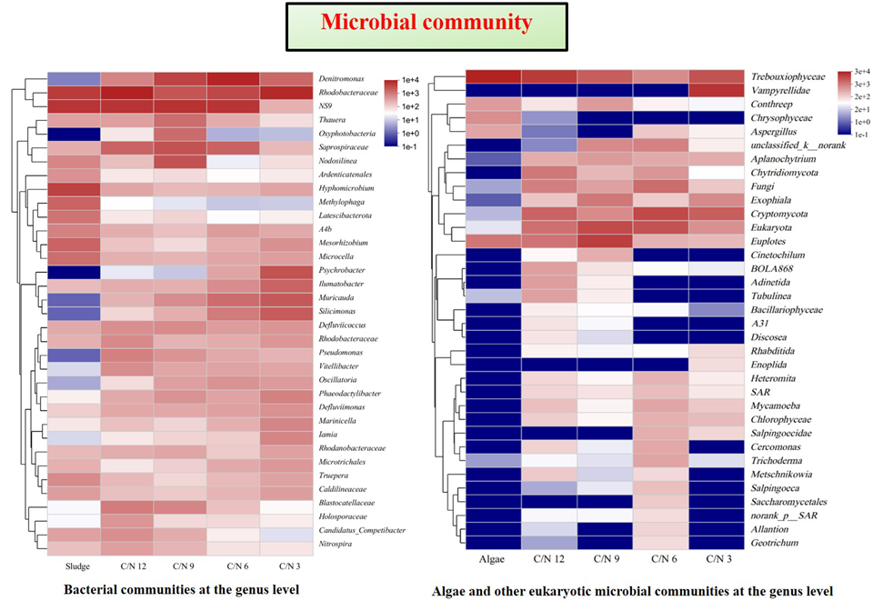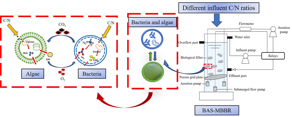 海水养殖废水富含氮磷污染物,直接排放易引发水体富营养化,传统生物处理技术存在脱氮效率低、能耗高、剩余污泥处理难等问题。菌藻共生系统通过协同作用可高效去除污染物并降低能耗,但其性能受C/N(碳氮比)影响显著。本研究通过构建BAS-MBBR系统(图1),探究不同C/N(12/1、9/1、6/1和3/1)对化学需氧量及氮磷去除效率、微生物酶活性、生物毒性效应与细菌及其他真核微生物群落结构的影响(图2),研究发现C/N为9/1时系统处理海水养殖废水性能最佳。该研究通过优化C/N,调控微生物代谢与群落相互作用,从而影响BAS-MBBR处理海水养殖废水性能,为低碳高效的废水处理技术实施提供了新思路。