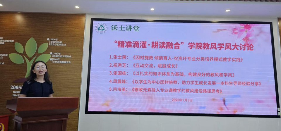 会上,张士荣老师以《因材施教,倾情育人--农资环专业分类培养模式教学实践》为题,分享了农业资源与环境专业“因材施教”育人实践经验,提出以专业教师兼班主任为抓手,构建全程化育人体系,将理论教学与田间实践、企业实习深度融合,通过分类培养模式精准助力学生成长成才。