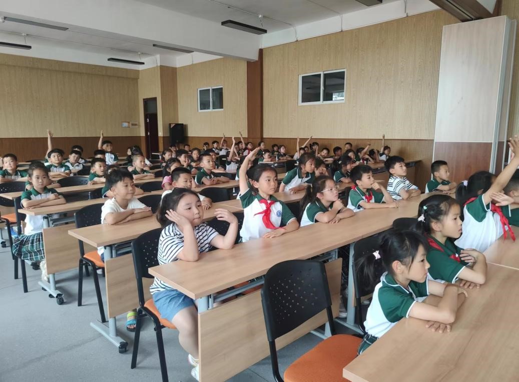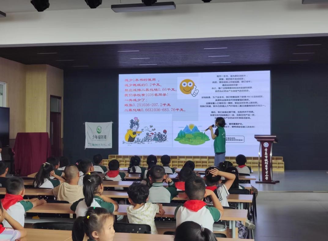最后,宣讲员向同学们介绍了制作一本书的过程,告诉大家树木仍然是从大气中吸收二氧化碳最有效的方法之一,从而呼吁同学们爱护书本,保护树木,为实现“双碳”目标尽自己的一份力量。同学们目光坚定,声音洪亮,充分展现出自己保护环境的决心。