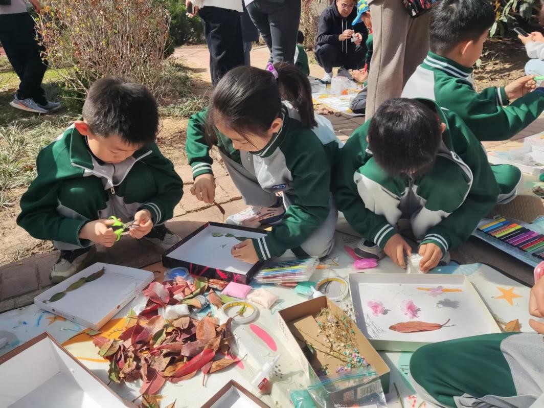 在参观落叶堆肥区之后,学生讲师们引领小朋友们共同捡拾落叶,意图通过艺术创作赋予这些落叶新的生命意义。学生讲师引导小朋友观察树叶的形状、颜色、纹理、结构,讲授树叶创意画制作技巧,小朋友们听后立即投入到创作中,充分发挥自己的想象力,将树叶用剪刀裁剪成不同的形状,通过拼接粘贴等步骤,小小的树叶变成了含苞待放的花朵、活灵活现的小动物……一幅幅精美的树叶创意画作品在大家的手中诞生,充分展现了小朋友丰富的想象力和创造力。透过暖暖的阳光,小朋友专注作画的身影也成为了春日里的一道美景。