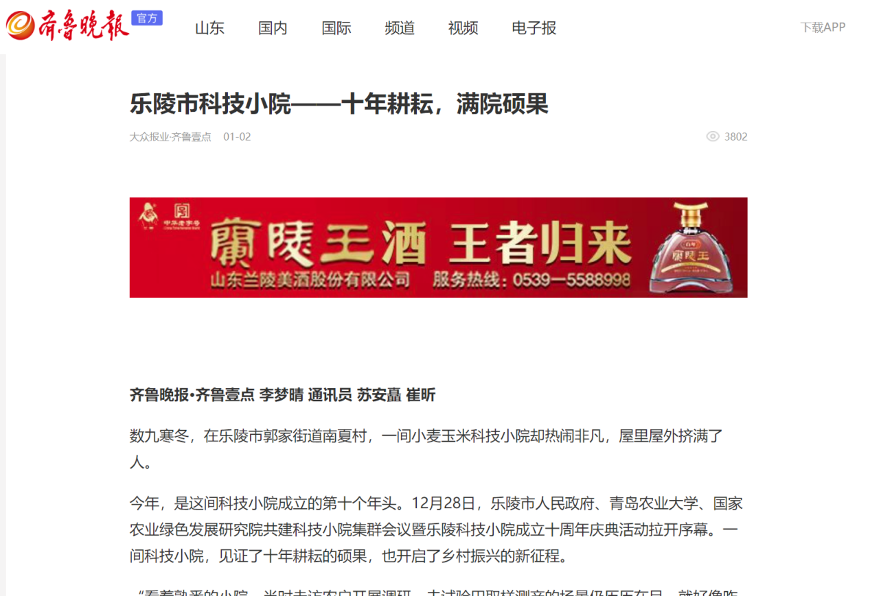 1月2日,齐鲁晚报以《乐陵市科技小院——十年耕耘,满院硕果》为题报道我校与乐陵市人民政府、国家农业绿色发展研究院共建科技小院集群会议暨乐陵科技小院成立十周年庆典活动。