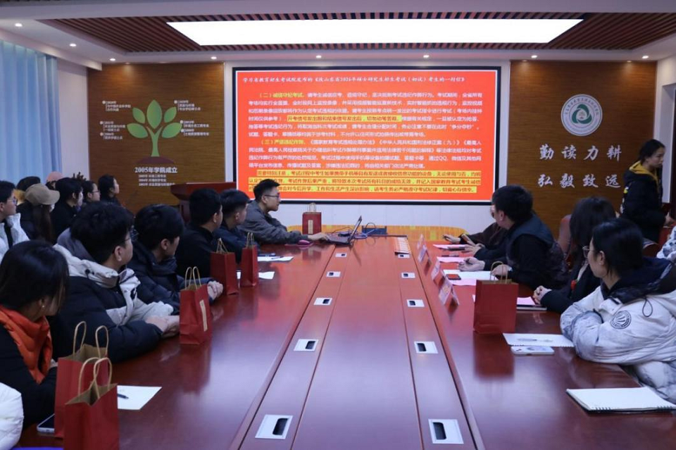 宁刚带领参会学生研读了山东省教育招生考试院发布的《致山东省2026年硕士研究生招生考试(初试)考生的一封信》,并从考研前期的各项准备工作、考风考纪教育、考研期间的各项安全事宜等方面展开了详细讲解。学生代表们结合自身的复习节奏与备考感悟,相互交流并分享各自的备考经验,为冲刺阶段的复习与心态调整提供了具有实用价值的参考。